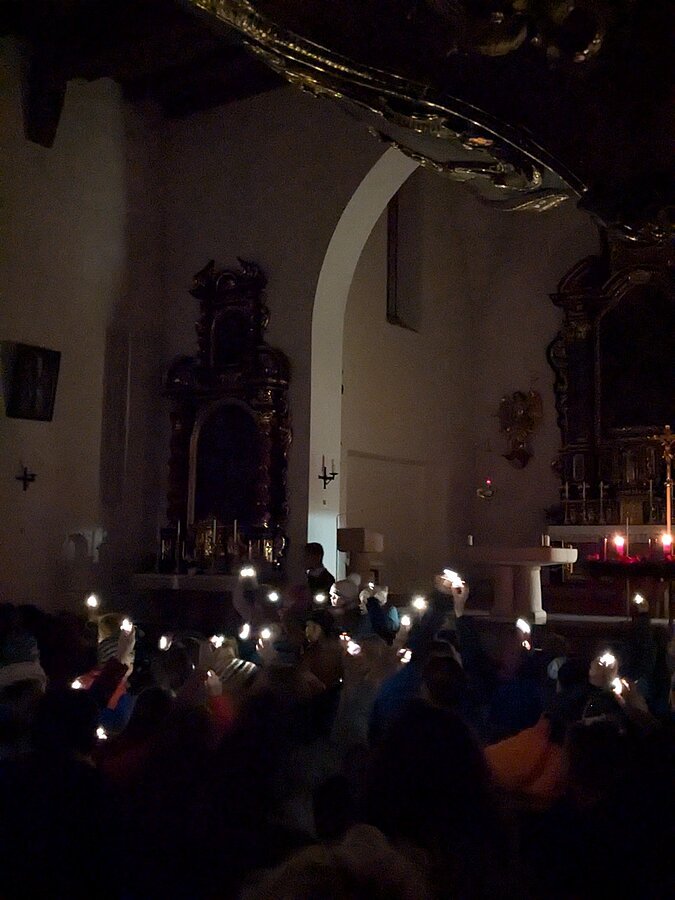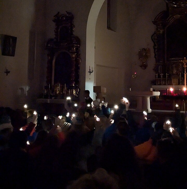 Die Theatergruppe begann mit einem Adventsgedicht und ließ dann einige Tiere stellvertretend darüber diskutieren, was denn das Wichtigste an Weihnachten sei. Die Klassen 3b und 1a trugen ein Lied über das Weihnachtsgeräusch vor – und ansonsten waren alle Beteiligten eifrig mit dem Singen beschäftigt und schmetterten - unter Begleitung von Alexander Uhl an der Orgel - sowohl traditionelle, als auch modernere Weihnachtslieder. Zum Schluss wurde das Lied „Tragt in die Welt nun ein Licht“ ganz wörtlich genommen und die Kinder durften mit einer brennenden (LED) Kerze aus der Kirche hinaus auf den vom Elternbeirat vorbereiteten Mini - Weihnachtsmarkt auf dem Kirchenplatz.