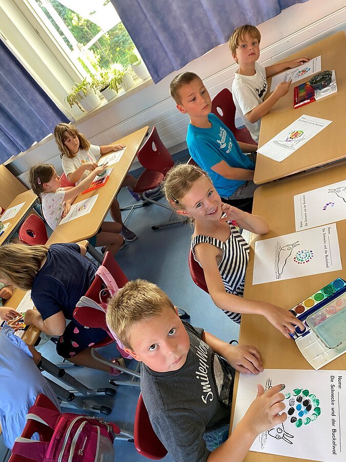 Am 1. Juli 2025 besuchten die Vorschulkinder der BRK Kita Am Bahnweiher die Klasse 1b der Grundschule Pleinfeld. Sie erlebten einen besonderen Tag voller Kreativität und Lernen. Im Mittelpunkt stand das Bilderbuchkino des beliebten Kinderbuchs "Die Schnecke und der Buckelwal" von Axel Scheffler und Julia Donaldson, welches von den Erstklässlern vorgelesen wurde.