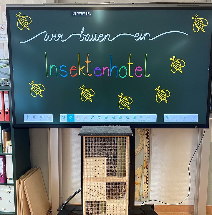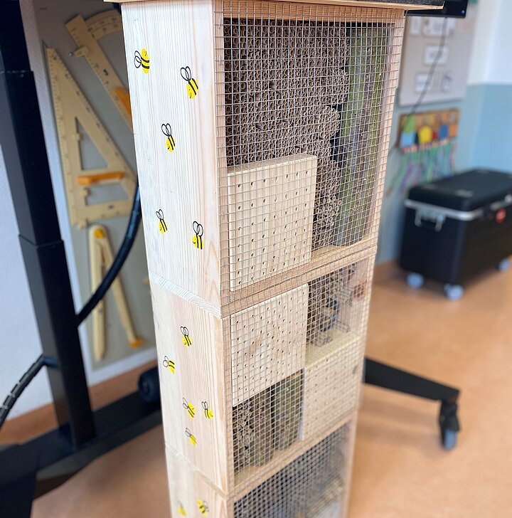 Das fertige Insektenhotel bekommt einen Platz auf dem Schulgelände und wird hoffentlich bald viele kleine Bewohner anlocken.