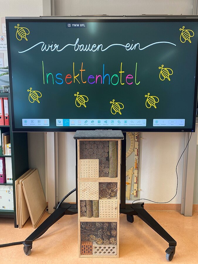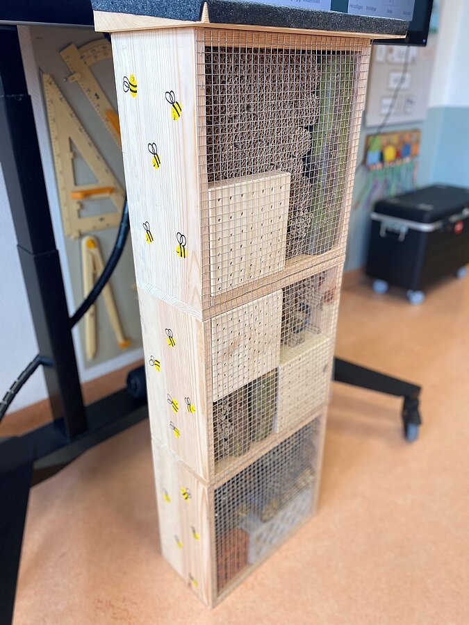 Das fertige Insektenhotel bekommt einen Platz auf dem Schulgelände und wird hoffentlich bald viele kleine Bewohner anlocken.