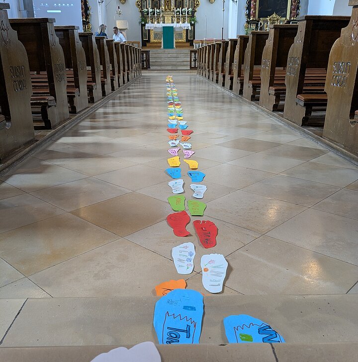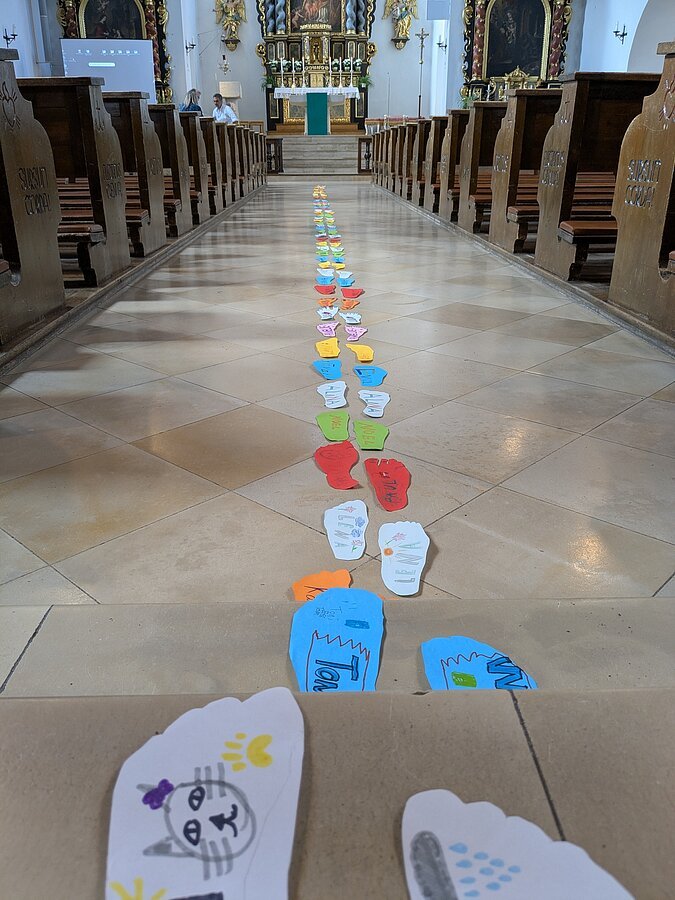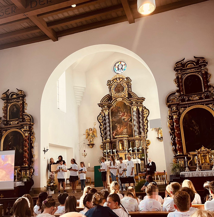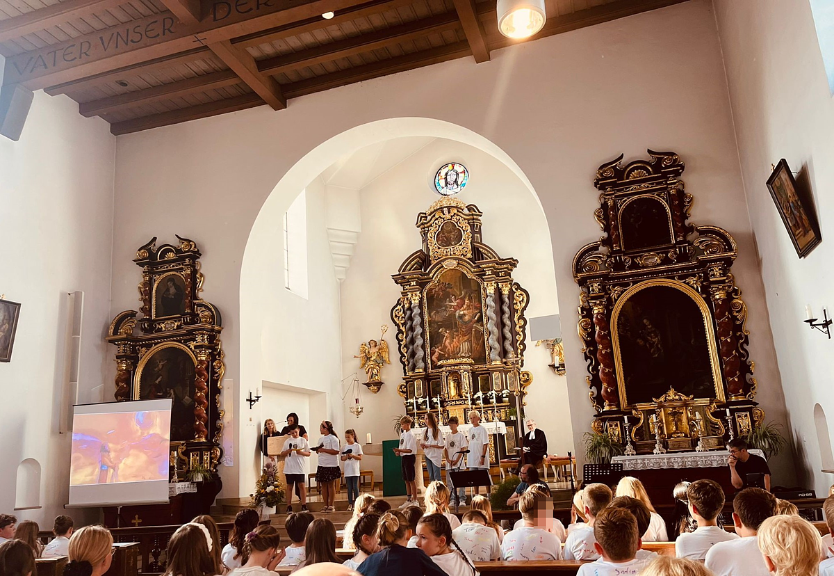 Am 23.Juli verabschiedeten wir unsere „Großen“ in der katholischen Pfarrkirche St.Nikolaus zunächst mit einem Gottesdienst. Zur Geschichte von Mose und dem Aufbruch der Israeliten in ein neues Land machten sich die Schülerinnen und Schüler eigene Gedanken und entdeckten, dass auch sie in eine ungewisse Zukunft an einer neuen Schule aufbrechen.