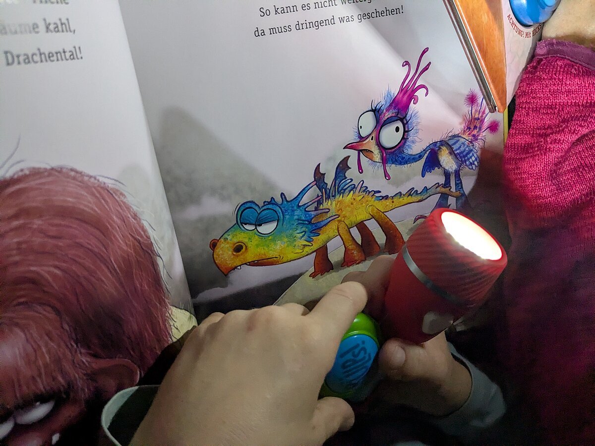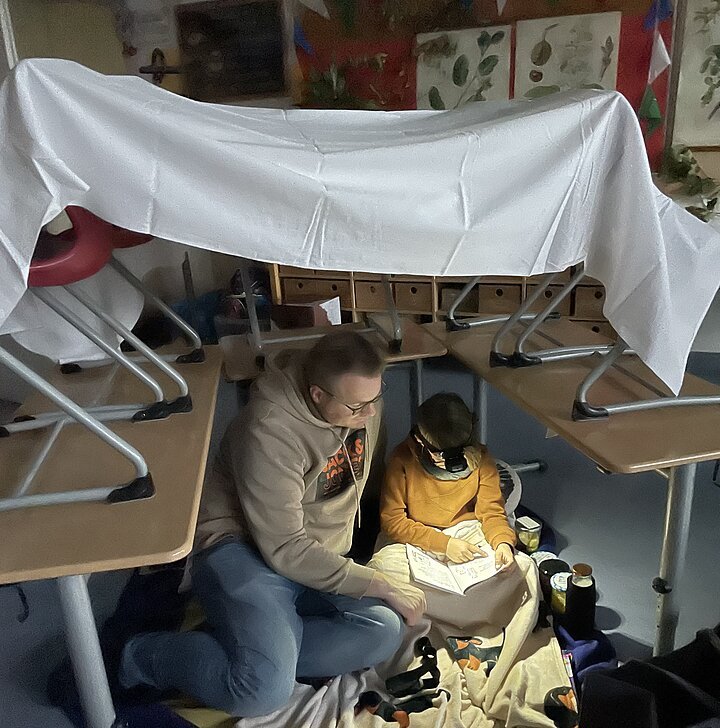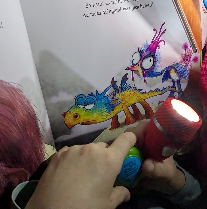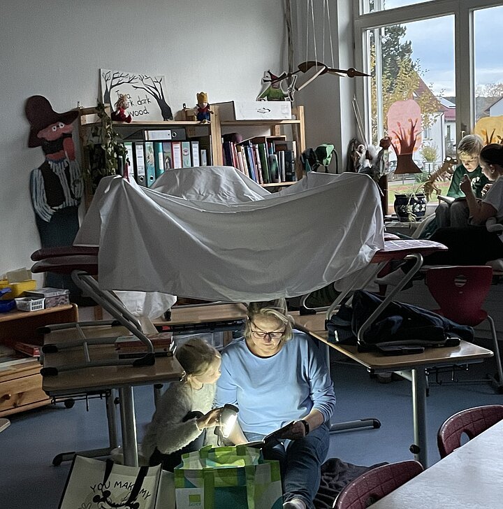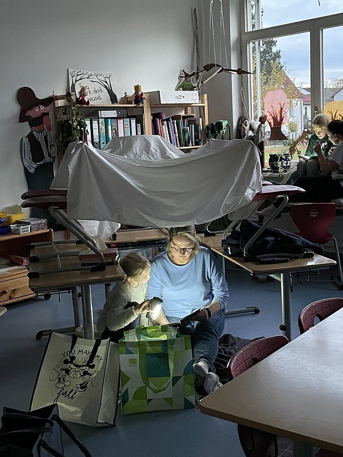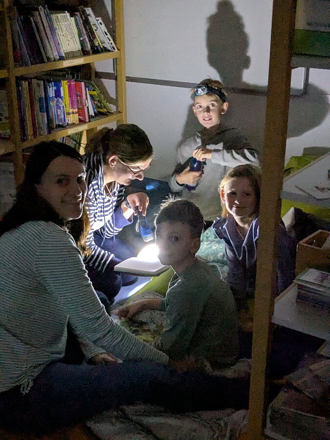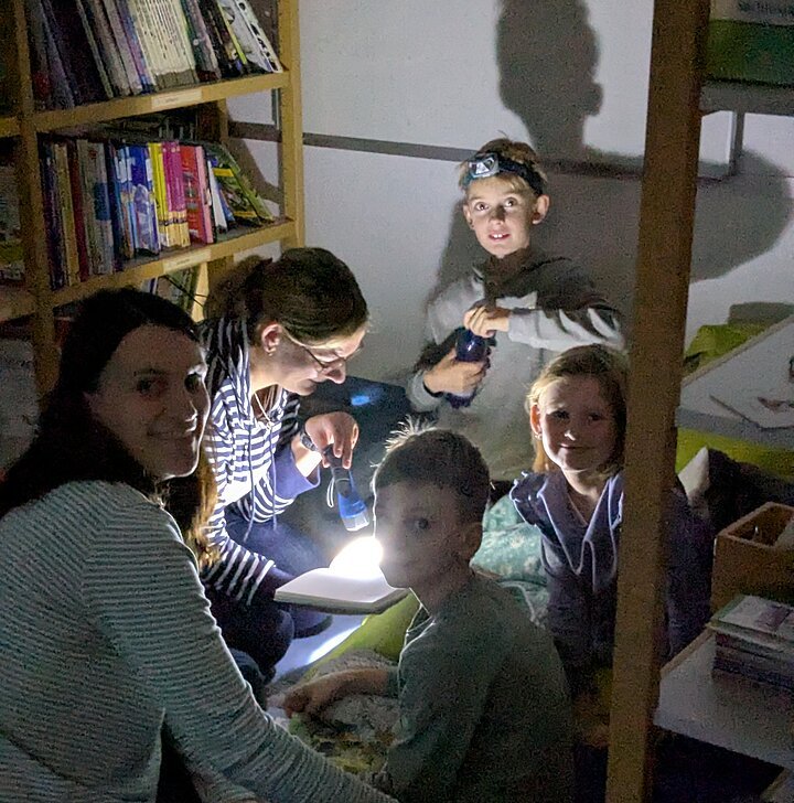und die Taschenlampen der Kinder und Eltern, die sich am 29. Oktober zum ersten Taschenlampenlesen in der Grundschule Pleinfeld einfanden. Ab 16.50 Uhr war das Schulhaus geöffnet und alle Beteiligten durften sich im Schulhaus einen Ort zum Lesen aussuchen und mit den mitgebrachten Decken und Kissen gemütlich ausstatten. Mit der einbrechenden Dunkelheit galt dann die Devise – Licht aus, Kopfkino an! In allen Ecken und Nischen des Schulhauses fand man Eltern, die mit ihren Kindern lasen, vorlasen oder sich vorlesen ließen. Alles im Flüsterton, so dass niemand gestört wurde. Eine Atmosphäre „so richtig zum Runterkommen“, wie ein beteiligter Vater meinte. Auch die Kinder hatten Spaß an diesem analogen Vergnügen, so dass es sicher nicht die letzte Taschenlampenlesenacht der Grundschule Pleinfeld bleiben wird.